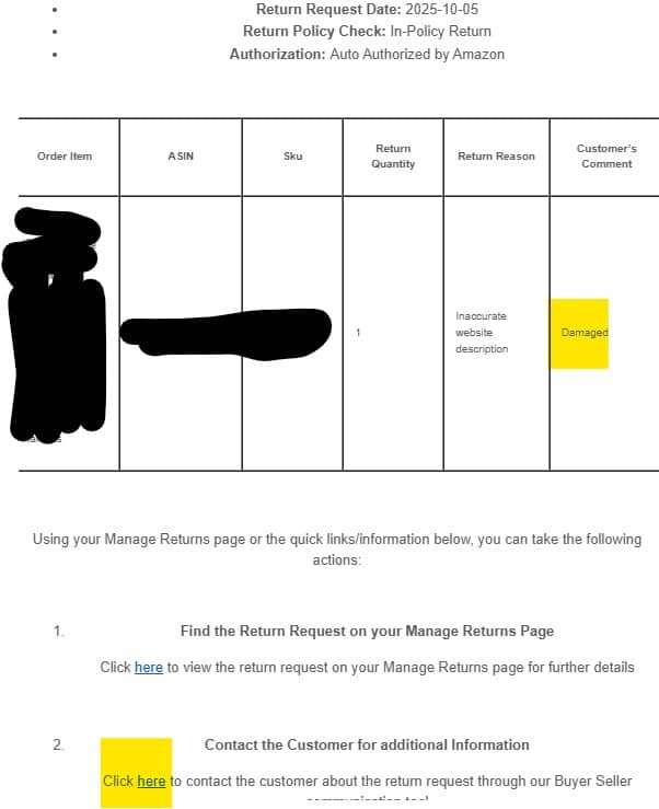So I get a FBM (merchant fulfilled return authorization like this. Of course, if the item was damaged in transit, I'd like to let the customer they don't need to return the item to me. Save me the return shipping why don't ya. I'll give them a returnless refund. All I need are images of the damage. So I click contact the customer...